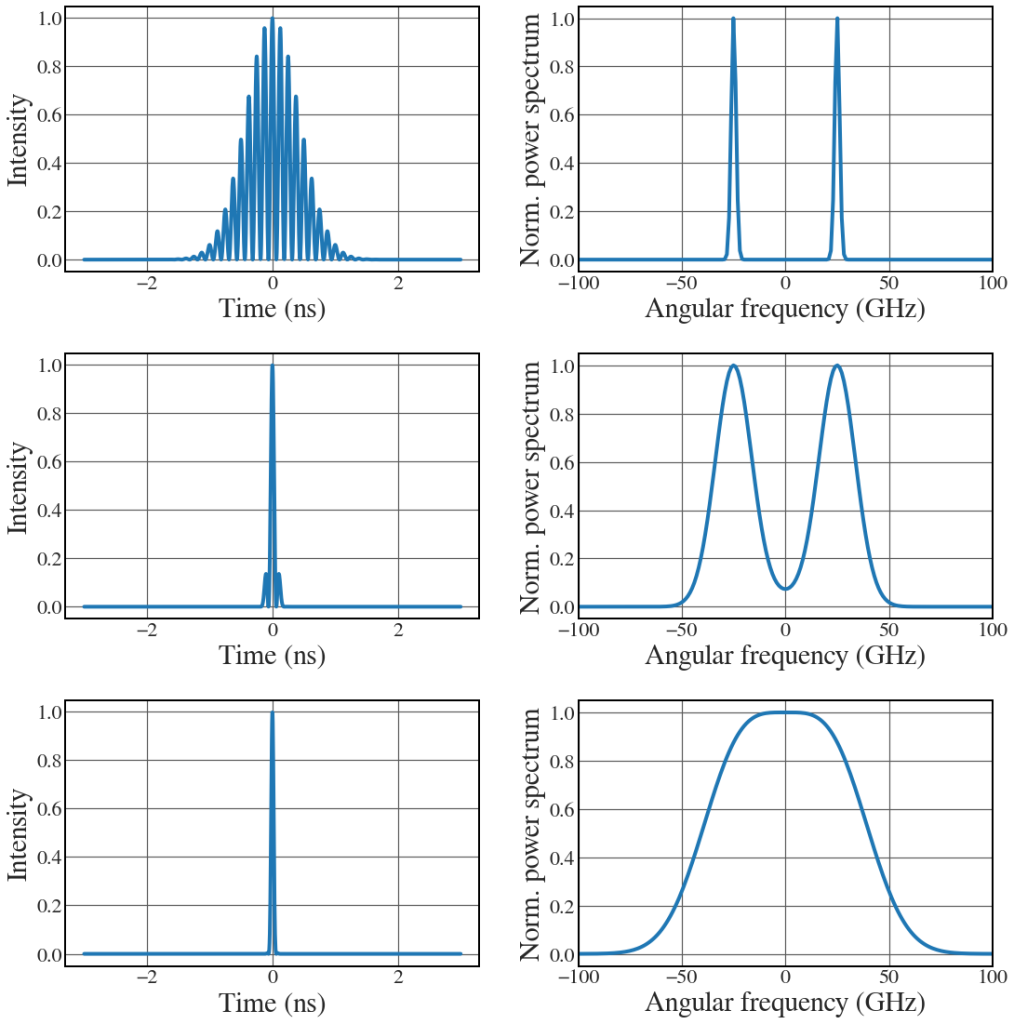 n_points = 1500 # Time sequence t = np.linspace(-3, 3, n_points) # units of nanoseconds dt = t[2] - t[1] v_0 = 4 # Central frequency, 1/ns omega_0 = 25 # 2*np.pi*4 # Central frequency # Frequency sequence v = (1.0/ (n_points*dt))* (np.arange(n_points) - n_points//2) omega = (2*np.pi/ (n_points*dt))* (np.arange(n_points) - n_points//2) dv = v[1]-v[0] # Pulse duration delta_t1 = 0.6 #ns delta_t2 = 0.08 #ns delta_t3 = 0.04 #ns # Define pulse with Gaussian envelope pulse1 = np.cos(omega_0*t) * np.exp(-t**2/(2*delta_t1**2)) pulse2 = np.cos(omega_0*t) * np.exp(-t**2/(2*delta_t2**2)) pulse3 = np.cos(omega_0*t) * np.exp(-t**2/(2*delta_t3**2)) # Fourier Transform of the pulse f_p1 = np.fft.fftshift(np.fft.fft(pulse1))/np.sqrt(n_points) f_p2 = np.fft.fftshift(np.fft.fft(pulse2))/np.sqrt(n_points) f_p3 = np.fft.fftshift(np.fft.fft(pulse3))/np.sqrt(n_points) tick_size = 22 font_size = 30 with plt.style.context(('seaborn-v0_8-whitegrid')): plt.rcParams.update(synchrotron_style) fig, axs = plt.subplots(3,2, figsize=(16,16)) axs[0,0].plot(t, np.real(pulse1)**2, lw=4) axs[0,0].tick_params(axis='x', labelsize=tick_size) axs[0,0].tick_params(axis='y', labelsize=tick_size) axs[0,0].set_xlabel('Time (ns)', fontsize=font_size) axs[0,0].set_ylabel('Intensity', fontsize=font_size) ### axs[0,1].plot(omega, np.abs(f_p1)**2/(np.abs(f_p1)**2).max(), lw=4) axs[0,1].set_xlim([-100, 100]) axs[0,1].tick_params(axis='x', labelsize=tick_size) axs[0,1].tick_params(axis='y', labelsize=tick_size) axs[0,1].set_xlabel('Angular frequency (GHz)', fontsize=font_size) axs[0,1].set_ylabel('Norm. power spectrum', fontsize=font_size) axs[1,0].plot(t, np.real(pulse2)**2, lw=4) axs[1,0].tick_params(axis='x', labelsize=tick_size) axs[1,0].tick_params(axis='y', labelsize=tick_size) axs[1,0].set_xlabel('Time (ns)', fontsize=font_size) axs[1,0].set_ylabel('Intensity', fontsize=font_size) ### axs[1,1].plot(omega, np.abs(f_p2)**2/(np.abs(f_p2)**2).max(), lw=4) axs[1,1].set_xlim([-100, 100]) axs[1,1].tick_params(axis='x', labelsize=tick_size) axs[1,1].tick_params(axis='y', labelsize=tick_size) axs[1,1].set_xlabel('Angular frequency (GHz)', fontsize=font_size) axs[1,1].set_ylabel('Norm. power spectrum', fontsize=font_size) axs[2,0].plot(t, np.real(pulse3)**2, lw=4) axs[2,0].tick_params(axis='x', labelsize=tick_size) axs[2,0].tick_params(axis='y', labelsize=tick_size) axs[2,0].set_xlabel('Time (ns)', fontsize=font_size) axs[2,0].set_ylabel('Intensity', fontsize=font_size) ### axs[2,1].plot(omega, np.abs(f_p3)**2/(np.abs(f_p3)**2).max(), lw=4) axs[2,1].set_xlim([-100, 100]) axs[2,1].tick_params(axis='x', labelsize=tick_size) axs[2,1].tick_params(axis='y', labelsize=tick_size) axs[2,1].set_xlabel('Angular frequency (GHz)', fontsize=font_size) axs[2,1].set_ylabel('Norm. power spectrum', fontsize=font_size) plt.tight_layout() #w_pad=2 plt.show() |