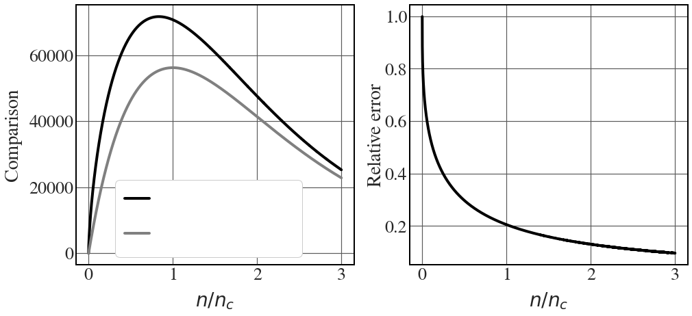 gamma = 800.0 beta = np.sqrt(1.0 - 1.0/gamma**2) nsteps = 5000 nc = 1.5*gamma**3 nmax = int(3*nc) n = np.arange(1,int((nmax-100)/nsteps)*nsteps, int(nmax/nsteps)) original_function = n**2 * special.jvp(n,n*beta)**2 asymptotic_expansion = (n/(2*np.pi*gamma)) * np.exp(-2*n/(3*gamma**3)) with plt.style.context(('seaborn-v0_8-whitegrid')): plt.rcParams.update(synchrotron_style) fig, axs = plt.subplots(1, 2,figsize=(16,7)) fig.subplots_adjust(hspace=0) # Note: the labels are added separately in the published book version axs[0].plot(n/nc, original_function, 'k', lw = 4, label=" ") axs[0].plot(n/nc, asymptotic_expansion, 'gray', lw = 4, label=" ") axs[0].set_ylabel('Comparison', fontsize=28, labelpad=10) axs[0].tick_params(axis='y', labelsize=26) axs[0].tick_params(axis='x', labelsize=26) axs[0].set_xlabel('$n/n_{c}$', fontsize=28, labelpad=10) axs[1].plot(n/nc, (original_function-asymptotic_expansion)/original_function, 'k', lw = 4) axs[1].set_xlabel('$n/n_{c}$', fontsize=28, labelpad=10) axs[1].set_ylabel('Relative error', fontsize=28, labelpad=0) axs[1].tick_params(axis='y', labelsize=26) axs[1].tick_params(axis='x', labelsize=26) axs[0].legend(fontsize = 36, frameon=True, framealpha = 1, labelspacing=0.5, handlelength = 1, loc=(0.14,0.03)) |