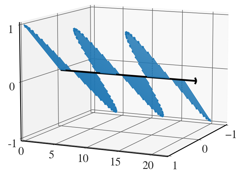 # These are the values for the components [phi_x, phi_y, Ex_mod, Ey_mod] to generate the different cases # Linear 0: [0,0,1,0] # Linear 45: [0,0,1,1] # Circular right: [0,-pi/2,1,1] # Circular left: [0,pi/2,1,1] k_vec = 2*np.pi/8 z = np.linspace(0,20,101) phi_x = 0 phi_y = 0 Ex_mod = 1 Ey_mod = 1 Ex = Ex_mod*np.cos(k_vec*z + phi_x) Ey = Ey_mod*np.cos(k_vec*z + phi_y) L = np.sqrt(Ex**2 + Ey**2) with plt.style.context(('seaborn-v0_8-whitegrid')): fig = plt.figure(figsize=(15,10)) plt.rcParams.update(synchrotron_style) ax = plt.subplot(projection='3d') ax.set_proj_type('persp') for i, j in enumerate(z): ax.quiver(0, j, 0, Ex[i], 0, Ey[i], linewidths=2, arrow_length_ratio=0.05) # Plot the axis ax.quiver(0,0,0, 0,22,0, arrow_length_ratio=0.01, linewidths=4, colors='black') ax.view_init(elev=10, azim=25) ax.set_ylim3d(0, 22) ax.set_xlim3d(-1, 1) ax.set_zlim3d(-1, 1) ax.set_zticks([-1,0,1]) ax.set_zticklabels([-1,0,1], fontsize=26) plt.xticks([-1, 0, 1], fontsize = 26) plt.yticks([0,5,10,15,20], fontsize = 26) plt.show() |