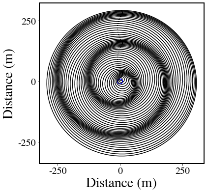 c = 2.99792458e8 # m/s, speed of light beta = 0.5 rho = 10 omega_0 = beta*c/rho theta = np.linspace(0, 2*np.pi, 100, endpoint=True) t = np.linspace(0.000001,0, 50) with plt.style.context(('default')): plt.rcParams.update(synchrotron_style) fig = plt.figure(figsize=(6,6)) plt.plot(rho*np.cos(theta), rho*np.sin(theta), 'b', lw=2) for i,j in enumerate(t): cx = rho*np.cos(omega_0*j) cy = rho*np.sin(omega_0*j) a = cx + c*j*np.cos(theta) b = cy + c*j*np.sin(theta) plt.plot(b, a, 'k') plt.xlabel("Distance (m)", fontsize=28) plt.ylabel("Distance (m)", fontsize=28) plt.xticks(ticks = [-250, 0, 250],labels=("-250", "0", "250"), fontsize = 20) plt.yticks(ticks = [-250, 0, 250],labels=("-250", "0", "250"), fontsize = 20) plt.show() |