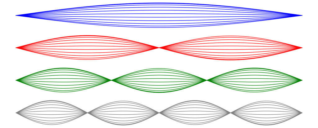 x = np.linspace(0, 2*np.pi, 1000) t1 = np.sin(x/2) t2 = np.sin(x) t3 = np.sin(3*x/2) t4 = np.sin(4*x/2) t = [t1,t2,t3,t4] colors = ['blue', 'red', 'green', 'gray'] fig, ax = plt.subplots(4, 1,figsize=(25,10), sharex=True) for i in range(1,11,1): for j in range(4): ax[j].plot(x, np.cos(np.pi*i/11)*t[j], lw = 2, color=colors[j]) for j in range(4): ax[j].plot(x, t[j], lw = 2, color=colors[j]) ax[j].set_axis_off() plt.show() |