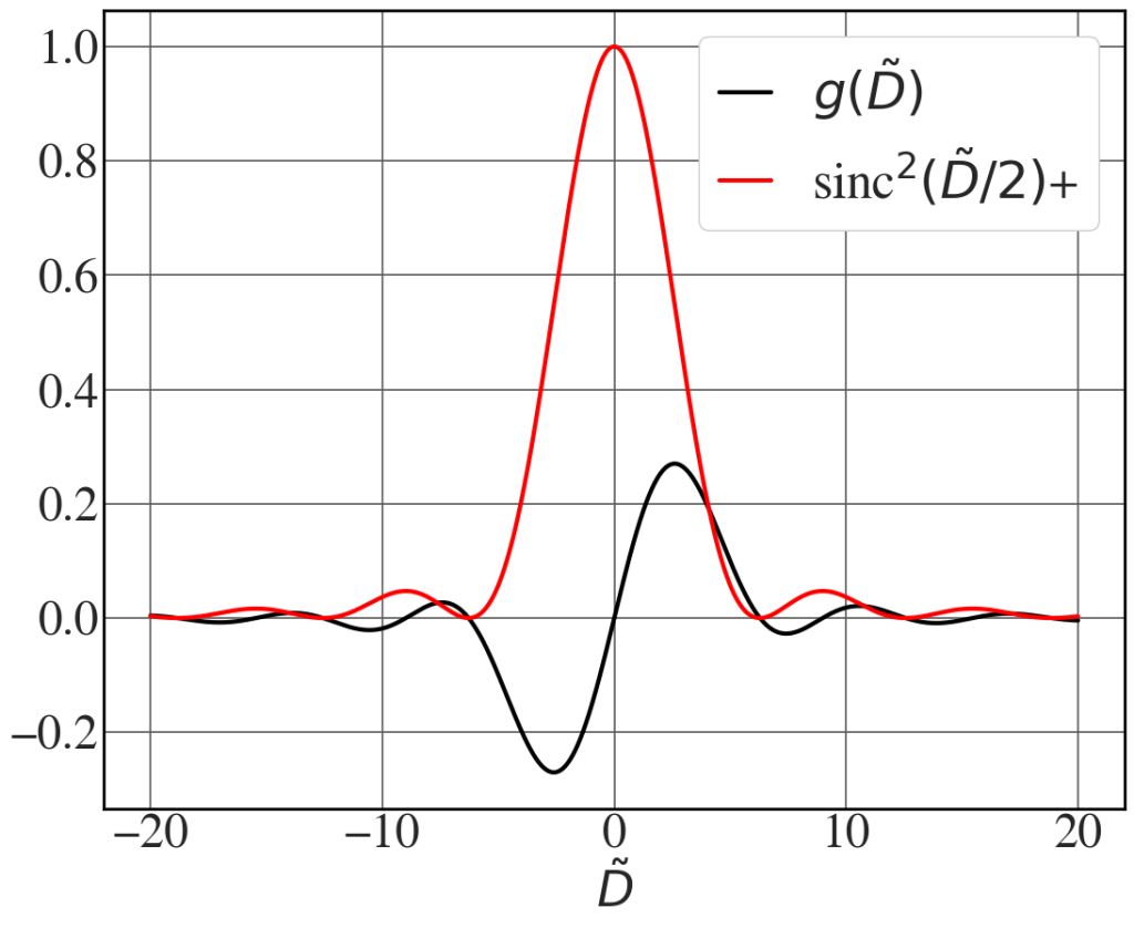det = np.linspace(-20,20,2000) #detuning parameter gain = (4/det**3)*(1 - np.cos(det)- 0.5*det*np.sin(det)) with plt.style.context(('seaborn-whitegrid')): plt.rcParams.update(synchrotron_style) fig, ax = plt.subplots(figsize=(12.7,10)) ax.plot(det, gain, 'k',lw=3, label = '$g(\\tilde{D})$') ax.plot(det, (np.sin(det/2) / (det/2))**2, 'r', lw=3, label = 'sinc$^{2}(\\tilde{D}/2)$+') ax.set_xlabel("$\\tilde{D}$",fontsize=34) ax.tick_params(axis='y', labelsize=34) ax.tick_params(axis='x', labelsize=34) ax.legend(fontsize=36, loc=1, frameon=True, framealpha=1, handlelength=1) plt.show() |
