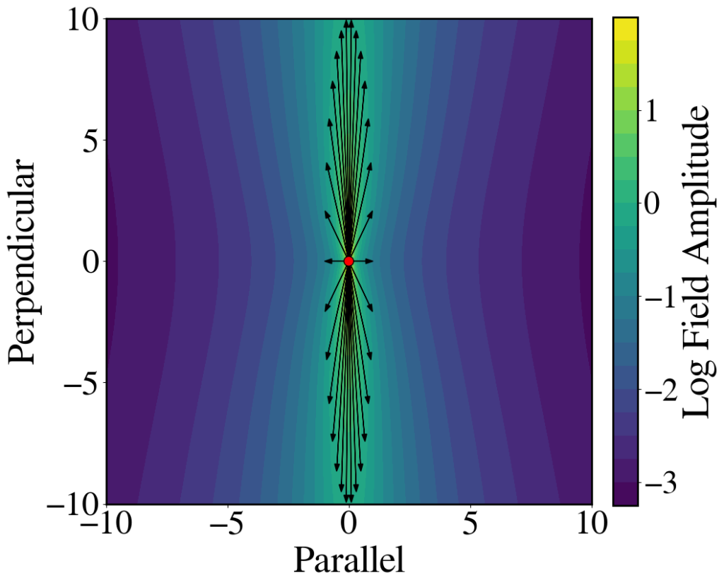 # Define coordinates on a grid nx, ny = 128, 128 limit = 10 x = np.linspace(-limit, limit, nx) y = np.linspace(-limit, limit, ny) X, Y = np.meshgrid(x, y) # Generate field q = 1e-9 position = [0,0] gamma=10 Ex, Ey = E(q, position,x=X,y=Y, gamma=gamma) with plt.style.context(('default')): plt.rcParams.update(synchrotron_style) fig = plt.figure(figsize=(10,10)) ax = fig.add_subplot(111) # First generate the contour plot cp = ax.contourf(X, Y, np.log10(np.hypot(Ex, Ey)), levels=20, cmap=plt.cm.viridis) # Then add field lines for theta in np.linspace(0, 2*np.pi,30, endpoint=False): ax.arrow(0, 0, 10*np.cos(theta)/gamma, 10*np.sin(theta), head_width=0.2, length_includes_head=True, fc='k') # Add a dot at the position of the charge ax.add_artist(Circle(position, 0.02*limit, facecolor='red', edgecolor='black', zorder=10)) # Set limits and aspect ratio ax.set_xlim(-limit,limit) ax.set_ylim(-limit,limit) ax.set_aspect('equal') # Add a colorbar and scale its size to match the chart size cbar = fig.colorbar(cp, ax=ax, fraction=0.046, pad=0.04) cbar_ticks = np.arange(np.round(np.log10(np.hypot(Ex, Ey)).min()), np.round(np.log10(np.hypot(Ex, Ey)).max()),1) cbar.ax.set_yticks(cbar_ticks) cbar.ax.tick_params(axis='y', labelsize=34) ax.set_xlabel('Parallel', fontsize=40) ax.set_ylabel('Perpendicular', fontsize=40) cbar.ax.set_ylabel('Log Field Amplitude', fontsize=40) ax.set_xticks([-10,-5,0,5,10]) ax.set_yticks([-10,-5,0,5,10]) ax.tick_params(axis='x', labelsize=36) ax.tick_params(axis='y', labelsize=36) plt.show() |