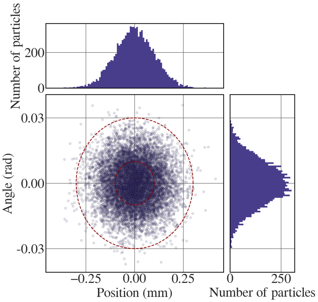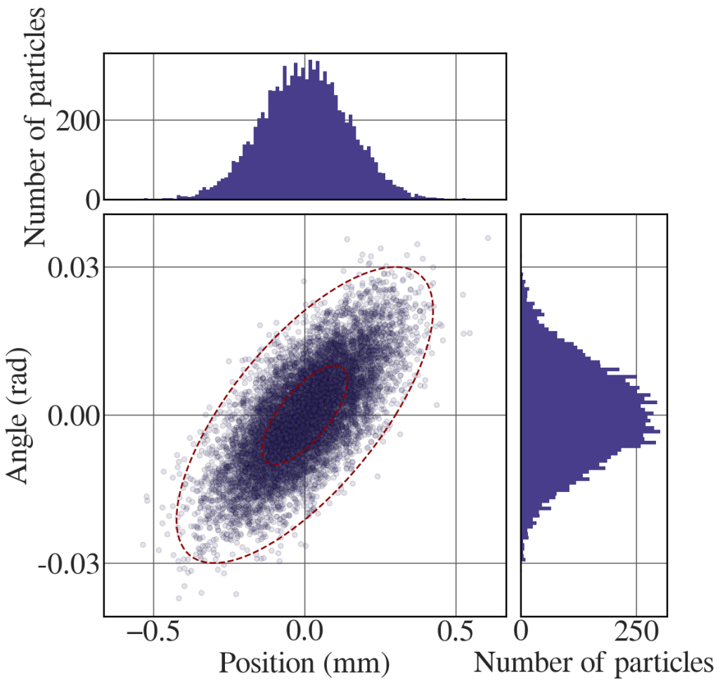 # Generate a phase-sapce distribution of representative points n_p = 10000 mu_x, sigma_x = 0, 0.1 # mean and standard deviation of position mu_xp, sigma_xp = 0, 0.01 # mean and standard deviation of angle sx1 = np.random.normal(mu_x, sigma_x, n_p) sxp = np.random.normal(mu_xp, sigma_xp, n_p) sx2 = sx1 + 10*np.tan(sxp) def scatter_hist(x, y, ax, ax_histx, ax_histy): ax_histx.tick_params(axis="x", labelbottom=False) ax_histy.tick_params(axis="y", labelleft=False) # the scatter plot: ax.scatter(x, y, c='darkslateblue', edgecolors='k', alpha=0.15) # now determine nice limits by hand: nbins = 100 xmax = np.max(np.abs(x)) ymax = np.max(np.abs(y)) binwidthx = 2*xmax/nbins binwidthy = 2*ymax/nbins binsx = np.arange(-xmax, xmax + binwidthx, binwidthx) binsy = np.arange(-ymax, ymax + binwidthy, binwidthy) ax_histx.hist(x, bins=binsx, color='darkslateblue') ax_histy.hist(y, bins=binsy, color='darkslateblue', orientation='horizontal') ax_histx.set_ylabel('Number of particles') ax_histx.yaxis.label.set_fontsize(36) ax_histx.tick_params(axis='y', labelsize=36) ax_histy.set_xlabel('Number of particles') ax_histy.xaxis.label.set_fontsize(36) ax_histy.tick_params(axis='x', labelsize=36) ax.set_xlabel('Position (mm)') ax.set_ylabel('Angle (rad)') ax.xaxis.label.set_fontsize(36) ax.tick_params(axis='x', labelsize=36) ax.set_yticks([-0.03,0,0.03], ["-0.03","0.00","0.03"]) # ax.set_xticks([-0.3,0,0.3], ["-0.3","0.0","0.3"]) ax.yaxis.label.set_fontsize(36) ax.tick_params(axis='y', labelsize=36) # definitions for the axes left, width = 0.1, 0.55 bottom, height = 0.1, 0.55 spacing = 0.02 rect_scatter = [left, bottom, width, height] rect_histx = [left, bottom + height + spacing, width, 0.2] rect_histy = [left + width + spacing, bottom, 0.2, height] with plt.style.context(('seaborn-whitegrid')): plt.rcParams.update(synchrotron_style) fig = plt.figure(figsize=(12, 12)) ax = fig.add_axes(rect_scatter) ax_histx = fig.add_axes(rect_histx, sharex=ax) ax_histy = fig.add_axes(rect_histy, sharey=ax) # use the previously defined function scatter_hist(sx1, sxp, ax, ax_histx, ax_histy) t = np.linspace(0, 2*np.pi, 100) ax.plot(sigma_x*np.cos(t) , sigma_xp*np.sin(t), color='darkred', lw=2, ls = '--') ax.plot(3*sigma_x*np.cos(t) , 3*sigma_xp*np.sin(t), color='darkred', lw=2, ls = '--') plt.show() |