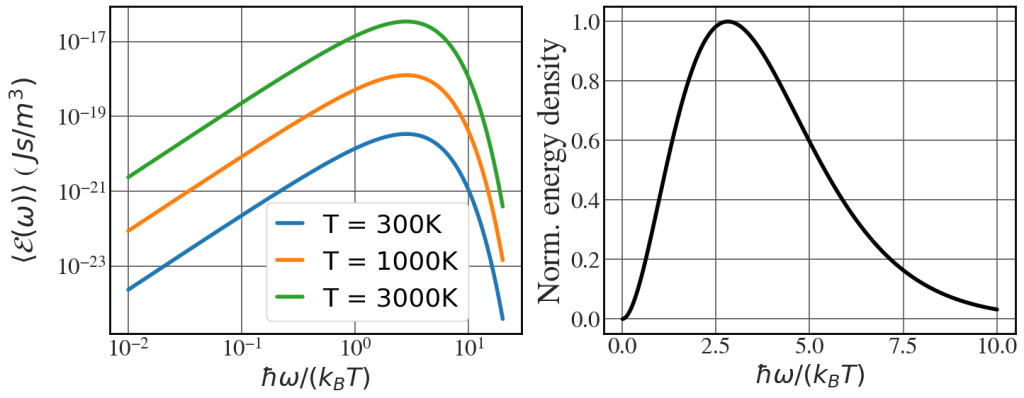 h = 6.62607015e-34 # Planck's constant hbar = h/(2*np.pi) kB = 1.380649e-23 # Boltzmann's constant c = 3.0e8 with plt.style.context(('seaborn-whitegrid')): plt.rcParams.update(synchrotron_style) fig, axs = plt.subplots(1, 2,figsize=(16.5,6)) for T in [300, 1000, 3000]: om = np.linspace(0.01*kB*T/hbar, 20*kB*T/hbar, 10000) en_density = (hbar*om**3/(np.pi**2 * c**3))/( np.exp(hbar*om/(kB*T)) -1) axs[0].loglog(hbar*om/(kB*T), en_density, lw = 4, label="T = "+str(T)+"K") axs[0].tick_params(axis='y', labelsize=24) axs[0].tick_params(axis='x', labelsize=24, pad=5) axs[0].set_ylabel('$\\langle \\mathcal{E}(\\omega)\\rangle$ ( $J s / m^{3})$', fontsize=28, labelpad = 15) axs[0].set_xlabel('$\\hbar \\omega / (k_{B}T)$', fontsize=26) axs[1].plot(hbar*om[:5000]/(kB*T), en_density[:5000]/en_density[:5000].max(), 'k', lw=4) axs[1].tick_params(axis='y', labelsize=24) axs[1].tick_params(axis='x', labelsize=24) axs[1].set_ylabel('Norm. energy density', fontsize=32) axs[1].set_xlabel('$\\hbar \\omega / (k_{B}T)$', fontsize=26) axs[0].legend(fontsize=26, frameon=True, framealpha=1, handlelength=1, loc='lower left', bbox_to_anchor=(0.35, 1e-25)) plt.show() |