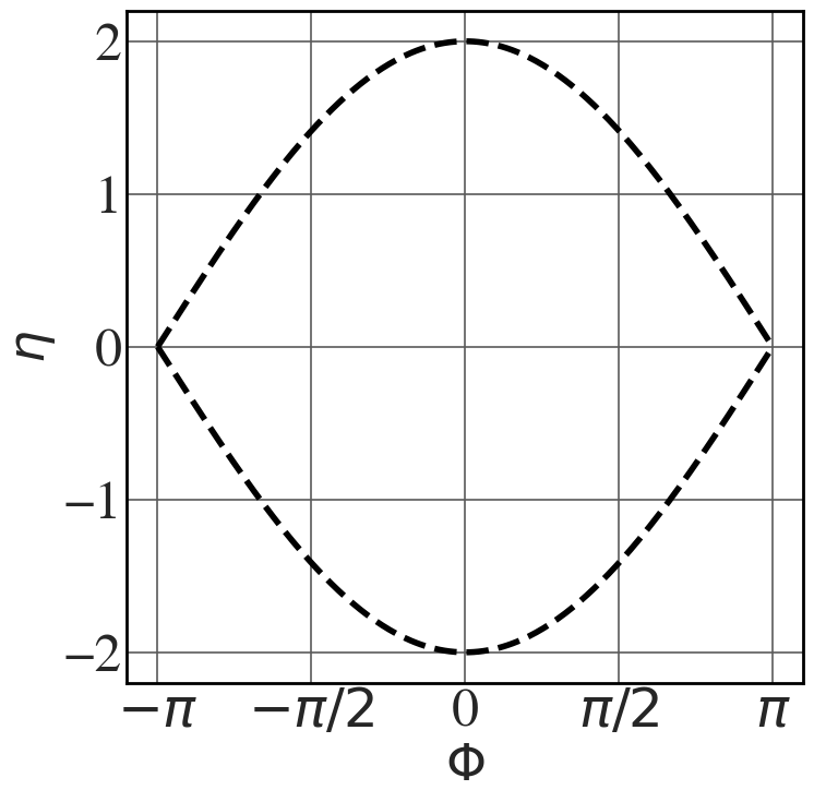 t = np.linspace(0,10.1,5000) eta0 = [0.2] Omega_sq=1 Phi_sep = np.linspace(-np.pi,np.pi,256) eta_sep = np.sqrt(2*Omega_sq*(np.cos(Phi_sep)+1)) with plt.style.context(('seaborn-v0_8-whitegrid')): plt.rcParams.update(synchrotron_style) fig, ax = plt.subplots(figsize=(8,8)) for i in eta0: ax.plot(Phi_sep, eta_sep, 'k--', lw=4) ax.plot(Phi_sep, -eta_sep, 'k--', lw=4) ax.set_xticks([-np.pi, -np.pi/2, 0, np.pi/2, np.pi]) ax.set_xticklabels(["$-\pi$", "$-\pi/2$", "0", "$\pi/2$", "$\pi$"], fontsize=22) ax.set_xlabel("$\\Phi$",fontsize=34) ax.set_ylabel("$\\eta$",fontsize=34) ax.tick_params(axis='y', labelsize=36) ax.tick_params(axis='x', labelsize=36) |