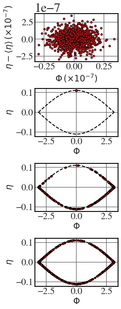 eps=1e-5 t = np.linspace(0,50000.1,5000) n_p = 1000 eta_0 = 0.01*eps*np.random.randn(n_p) + (1-eps)*2*np.sqrt(os) phi_0 = 0.01*eps*np.random.randn(n_p) eta = np.zeros((t.shape[0], n_p)) phi = np.zeros((t.shape[0], n_p)) for i,j in enumerate(eta_0): initial_conditions = [phi_0[i],j] final_conditions = odeint(pendulum,initial_conditions, t, args=(os,) ) phi[:,i] = final_conditions[:,0] eta[:,i] = final_conditions[:,1] Phi_sep = np.linspace(-np.pi,np.pi,256) eta_sep = np.sqrt(2*Omega_sq*(np.cos(Phi_sep)+1)) time_intervals = np.linspace(0,500000,65)#[:-2] colour = 'red' #'darkslateblue' with plt.style.context(('seaborn-v0_8-whitegrid')): plt.rcParams.update(synchrotron_style) fig, axs = plt.subplots(4,1, figsize=(4,10)) axs[0].scatter(1e6*phi[0,:], eta[0,:]-eta[0,:].mean(), s=20, c=colour, ec='k') axs[1].scatter(phi[0,:], eta[0,:], s=20, c=colour, ec='k') axs[2].scatter(phi[2500,:], eta[2500,:], s=20, c=colour, ec='k') axs[3].scatter(phi[-1,:], eta[-1:], s=20, c=colour, ec='k') for idx, ax in enumerate(axs.flat): if idx !=0: ax.plot(Phi_sep, eta_sep, 'k--', lw=2) ax.plot(Phi_sep, -eta_sep, 'k--', lw=2) if idx ==0: ax.set_xlabel("$\\Phi \\, (\\times 10^{-7})$",fontsize=20) ax.set_ylabel("$\\eta - \\langle \\eta \\rangle \\, (\\times 10^{-7})$",fontsize=20) ax.tick_params(axis='y', labelsize=22) ax.tick_params(axis='x', labelsize=22) else: ax.set_xlabel("$\\Phi$",fontsize=20) ax.set_ylabel("$\\eta$",fontsize=20) ax.tick_params(axis='y', labelsize=22) ax.tick_params(axis='x', labelsize=22) plt.tight_layout() |