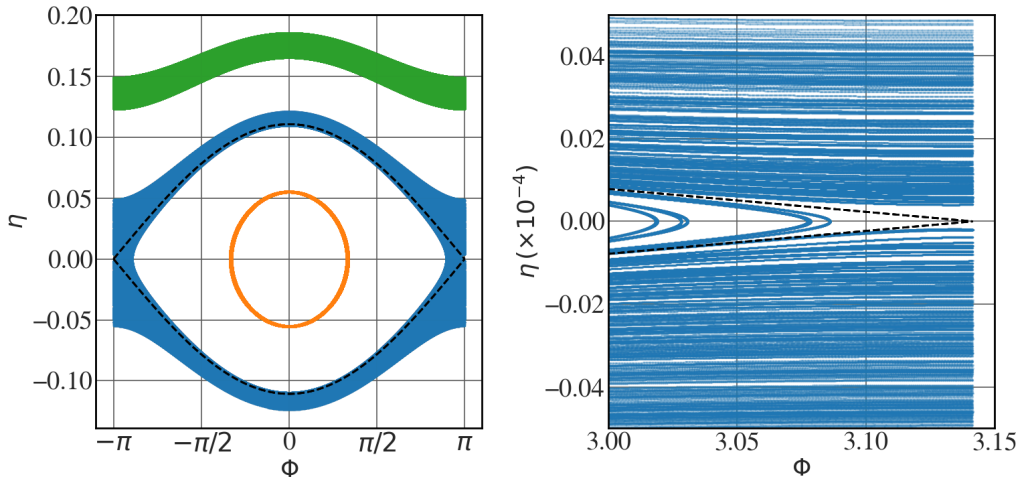def pendulum_perturbation(initial_conditions, t, Omega_sq, epsilon, omega_0): # Set the initial conditions Phi = initial_conditions[0] eta = initial_conditions[1] # Write the coupled equations d_Phi = eta d_eta = -Omega_sq *np.sin(Phi) + epsilon*Omega_sq *np.sin(omega_0*t) d_next_step = [d_Phi, d_eta] return d_next_step mu_0 = 1.25663706212e-6 c = 3e8 gamma_r = 1000 K = 0.1 l_u = 0.1 k_u = 2*np.pi/l_u ee = 1.602176634e-19 me = 9.1093837015e-31 lambda_L = 1e-9 omega_L = 2*np.pi*c/lambda_L E_0 = 5e8 os = (ee*k_u*K*E_0)/(2*me*c**2*gamma_r**2) omega_0=0.9*os t = np.linspace(0,50000,5000000) eps = 2.e-3 eta0 = [(1-eps)*2*np.sqrt(os), 0.5*(1-eps)*2*np.sqrt(os), 1.5*(1-eps)*2*np.sqrt(os)]#[0.11081005] print(eta0) Omega_sq=os epsilon=0.01 Phi_sep = np.linspace(-np.pi,np.pi,256) eta_sep = np.sqrt(2*Omega_sq*(np.cos(Phi_sep)+1)) with plt.style.context(('seaborn-v0_8-whitegrid')): plt.rcParams.update(synchrotron_style) fig, ax = plt.subplots(1,2, figsize=(16,8)) for i,j in enumerate(eta0): initial_conditions = [0,j] final_conditions = odeint(pendulum_perturbation,initial_conditions, t, args=(Omega_sq,epsilon, omega_0) ) ax[0].scatter((final_conditions[:,0]+np.pi)%(2*np.pi) - np.pi, final_conditions[:,1], s=2, alpha=0.25) ax[0].plot(Phi_sep, eta_sep, 'k--', lw=2) ax[0].plot(Phi_sep, -eta_sep, 'k--', lw=2) ax[1].scatter((final_conditions[:,0]+np.pi)%(2*np.pi) - np.pi, final_conditions[:,1], s=2, alpha=0.25) ax[1].plot(Phi_sep, eta_sep, 'k--', lw=2) ax[1].plot(Phi_sep, -eta_sep, 'k--', lw=2) ax[1].set_xlim(3,3.15) ax[1].set_ylim(-0.05,0.05) ax[0].set_xticks([-np.pi, -np.pi/2, 0, np.pi/2, np.pi]) ax[0].set_xticklabels(["$-\pi$", "$-\pi/2$", "0", "$\pi/2$", "$\pi$"], fontsize=16) ax[0].set_xlabel("$\\Phi$",fontsize=26) ax[0].set_ylabel("$\\eta$",fontsize=26) ax[0].tick_params(axis='y', labelsize=28) ax[0].tick_params(axis='x', labelsize=28) ax[1].set_xlabel("$\\Phi$",fontsize=26) ax[1].set_ylabel("$\\eta \\, (\\times 10^{-4})$",fontsize=26) ax[1].tick_params(axis='y', labelsize=28) ax[1].tick_params(axis='x', labelsize=28) plt.tight_layout() |