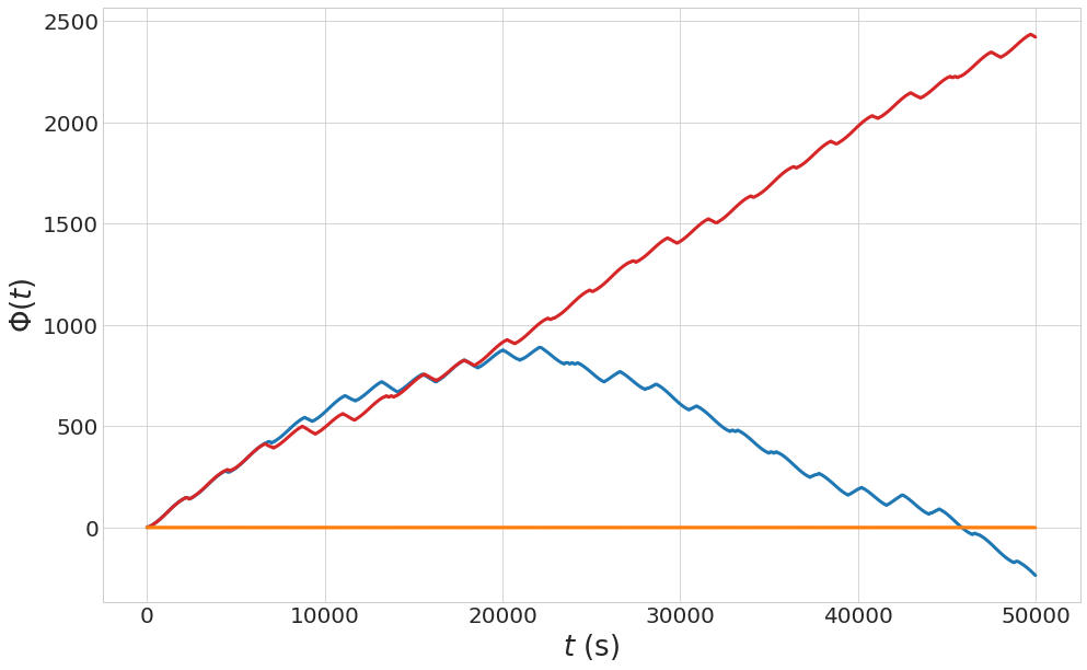 t = np.linspace(0,50000,1000000) epsilon=0.01 eta0 = [(1-eps)*2*np.sqrt(os), 0.9999*(1-eps)*2*np.sqrt(os), 0.5*(1-eps)*2*np.sqrt(os)] color = ['#1f77b4', '#d62728', '#ff7f0e'] omega_0=0.9*os with plt.style.context(('seaborn-whitegrid')): fig, ax = plt.subplots(figsize=(16,10)) for i,j in enumerate(eta0): initial_conditions = [0,j] final_conditions = odeint(pendulum_perturbation,initial_conditions, t, args=(Omega_sq,epsilon, omega_0) ) ax.plot(t[:],final_conditions[:,0], lw=3, color=color[i]) ax.set_xlabel("$t$ (s)",fontsize=26) ax.set_ylabel("$\\Phi (t)$",fontsize=26) ax.tick_params(axis='y', labelsize=20) ax.tick_params(axis='x', labelsize=20) plt.show() |