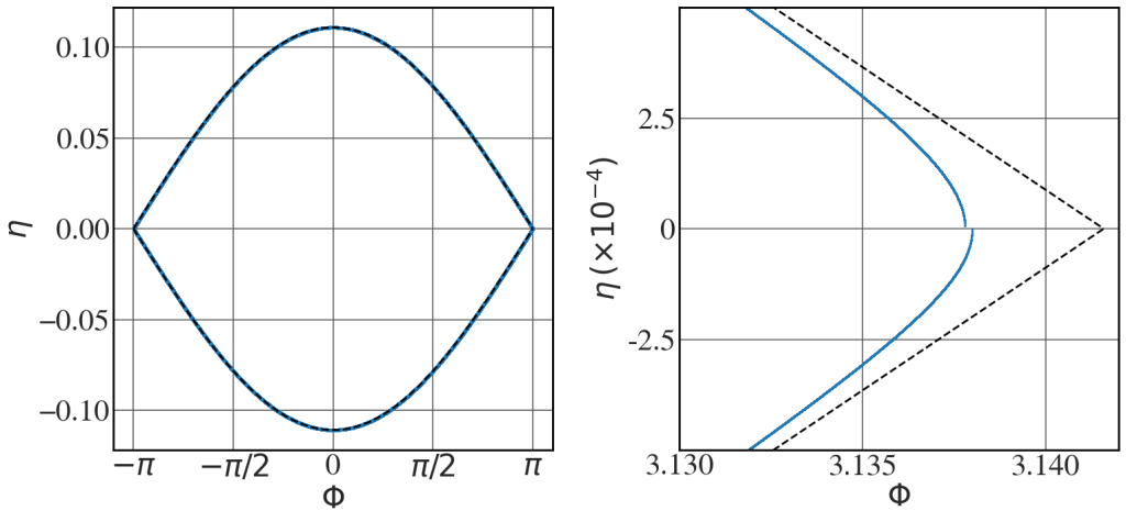def pendulum(initial_conditions, t, Omega_sq): # Set the initial conditions Phi = initial_conditions[0] eta = initial_conditions[1] # Write the coupled equations d_Phi = eta d_eta = -Omega_sq *np.sin(Phi) d_next_step = [d_Phi, d_eta] return d_next_step mu_0 = 1.25663706212e-6 c = 3e8 gamma_r = 1000 K = 0.1 l_u = 0.1 k_u = 2*np.pi/l_u ee = 1.602176634e-19 me = 9.1093837015e-31 lambda_L = 1e-9 omega_L = 2*np.pi*c/lambda_L E_0 = 5e8 os = (ee*k_u*K*E_0)/(2*me*c**2*gamma_r**2) t = np.linspace(0,555.5,5000000) eps = 1.e-6 eta0 = [(1-eps)*2*np.sqrt(os)] print(eta0) Omega_sq=os initial_conditions = [3.138,0] final_conditions = odeint(pendulum,initial_conditions, t, args=(Omega_sq,) ) Phi_sep = np.linspace(-np.pi,np.pi,256) eta_sep = np.sqrt(2*Omega_sq*(np.cos(Phi_sep)+1)) with plt.style.context(('seaborn-v0_8-whitegrid')): plt.rcParams.update(synchrotron_style) fig, ax = plt.subplots(1,2, figsize=(16,7.8)) # for i in eta0: #initial_conditions = [0,i] ax[0].scatter((final_conditions[:,0]+np.pi)%(2*np.pi) - np.pi, final_conditions[:,1], s=3) ax[0].plot(Phi_sep, eta_sep, 'k--', lw=2) ax[0].plot(Phi_sep, -eta_sep, 'k--', lw=2) ax[1].scatter((final_conditions[:,0]+np.pi)%(2*np.pi) - np.pi, final_conditions[:,1], s=1) ax[1].plot(Phi_sep, eta_sep, 'k--', lw=2) ax[1].plot(Phi_sep, -eta_sep, 'k--', lw=2) ax[1].set_xlim(3.13,3.142) ax[1].set_ylim(-0.0005,0.0005) ax[0].set_xticks([-np.pi, -np.pi/2, 0, np.pi/2, np.pi]) ax[0].set_xticklabels(["$-\pi$", "$-\pi/2$", "0", "$\pi/2$", "$\pi$"], fontsize=16) ax[0].set_xlabel("$\\Phi$",fontsize=30) ax[0].set_ylabel("$\\eta$",fontsize=30) ax[0].tick_params(axis='y', labelsize=30) ax[0].tick_params(axis='x', labelsize=30) ax[1].set_yticks([-0.00025, 0, 0.00025]) ax[1].set_yticklabels(["-2.5", "0", "2.5"], fontsize=30) ax[1].set_xlabel("$\\Phi$",fontsize=30) ax[1].set_ylabel("$\\eta \\, (\\times 10^{-4})$",fontsize=30) ax[1].tick_params(axis='y', labelsize=30) ax[1].tick_params(axis='x', labelsize=30) plt.tight_layout() |