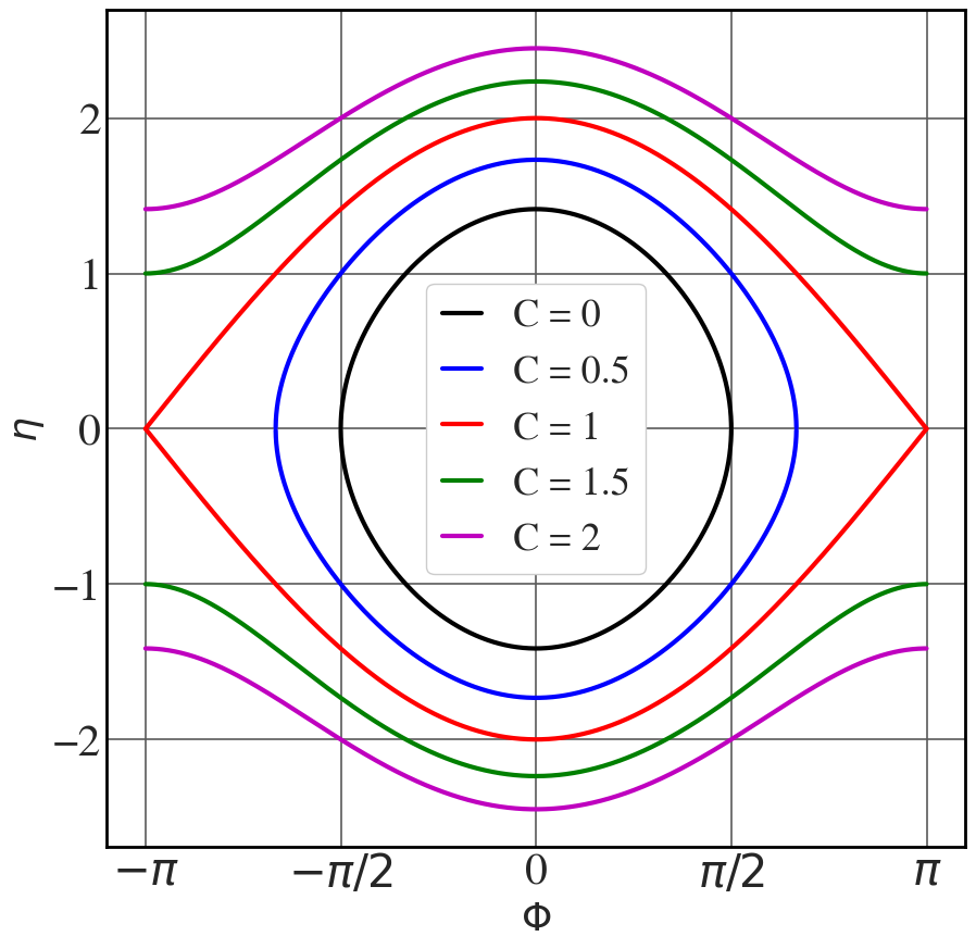 Phi = np.linspace(-np.pi,np.pi,65536) Omega_sq=1 line_colour = ["k", "b", "r", "g", "m"] with plt.style.context(('seaborn-v0_8-whitegrid')): plt.rcParams.update(synchrotron_style) fig, ax = plt.subplots(figsize=(10.2,10)) for i, C in enumerate([0,0.5,1,1.5,2]): eta = np.sqrt(2*Omega_sq*(np.cos(Phi)+C)) ax.plot(Phi, eta, color = line_colour[i], lw=3) ax.plot(Phi, -eta, color = line_colour[i], lw=3, label="C = "+str(C)) ax.set_xticks([-np.pi, -np.pi/2, 0, np.pi/2, np.pi]) ax.set_xticklabels(["$-\pi$", "$-\pi/2$", "0", "$\pi/2$", "$\pi$"], fontsize=16) ax.set_xlabel("$\\Phi$",fontsize=26) ax.set_ylabel("$\\eta$",fontsize=26) ax.tick_params(axis='y', labelsize=30) ax.tick_params(axis='x', labelsize=30 ) plt.legend(fontsize=26, frameon=True, framealpha=1, handlelength=1) plt.show() |