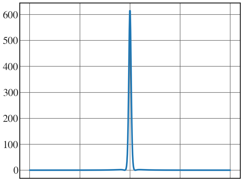 bbeta = 0.8 # replace with 0.4 for Fig. 11.13(a) n = 1 s = np.linspace(-np.pi,np.pi, 500) aux = np.zeros_like(s) for n in np.arange(-100,100,1): aux = aux + n*np.exp(1j*n*s)*special.jvp(n, n*bbeta) auxil = np.abs(aux)**2 with plt.style.context(('seaborn-v0_8-whitegrid')): plt.rcParams.update(synchrotron_style) fig,ax = plt.subplots(figsize=(10,8)) plt.plot(s,auxil, lw=4) plt.xticks(fontsize = 24) plt.yticks(fontsize = 26) ax.set_xticks([-np.pi,-np.pi/2, 0,np.pi/2,np.pi],labels=["", "", "", "",""]) plt.show() |