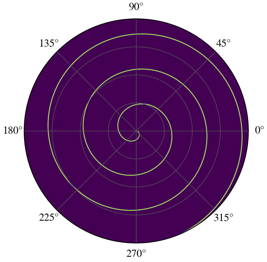 import tqdm bbeta = 0.8 # replace with 0.4 to generate Fig. 11.13(b) phi = np.linspace(0, 2*np.pi, 3600) r = np.arange(0, 20, 0.002) rr, theta = np.meshgrid(r, phi) values = np.random.random((phi.size, r.size)) s = theta + rr aux = np.zeros_like(s) n_max = 200 for n in tqdm.tqdm(np.arange(-n_max,n_max,1)): aux = aux + n*np.exp(1j*n*s)*special.jvp(n, n*bbeta) auxil = np.abs(aux)**2 with plt.style.context(('default')): plt.rcParams.update(synchrotron_style) fig, ax = plt.subplots(subplot_kw=dict(projection='polar'), figsize=(10,10)) ax.contourf(theta, rr, auxil, levels=200) ax.set_rticks([0,5, 10,15,20]) ax.set_yticklabels([]) ax.tick_params(axis='y', labelsize=26) ax.tick_params(axis='x', labelsize=26) positions = [0, np.pi/4, np.pi/2, 3*np.pi/4, np.pi, 5*np.pi/4, 3*np.pi/2, 7*np.pi/4] for i,j in enumerate(ax.get_xticklabels()): j.set_position((positions[i],-0.05)) plt.show() |