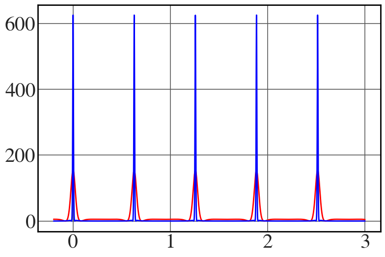 bbeta1 = 0.8 bbeta2 = 0.4 n_max = 250 omega_0 = 10 t = np.linspace(-0.2,3, 10000) s = omega_0*t col = ['r', 'b'] with plt.style.context(('seaborn-v0_8-whitegrid')): plt.rcParams.update(synchrotron_style) fig = plt.figure(figsize=(9,6)) for i, bbeta in enumerate([0.4,0.8]): aux = np.zeros_like(s) for n in np.arange(-n_max,n_max,1): aux = aux + n*np.exp(1j*n*s)*special.jvp(n, n*bbeta) if bbeta == 0.4: auxil = 20*np.abs(aux)**2 else: auxil = np.abs(aux)**2 plt.plot(t,auxil, lw=2, color = col[i]) plt.show() |