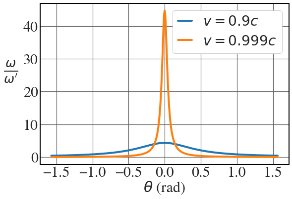 c = 1. # set the speed of light in natural unit v1 = 0.9 v2 = 0.999 beta1 = v1/c beta2 = v2/c gamma1 = 1.0/ np.sqrt(1.0 - v1**2/c**2) gamma2 = 1.0/ np.sqrt(1.0 - v2**2/c**2) theta = np.linspace(-np.pi/2, np.pi/2, 500, endpoint=False) fig = plt.figure(figsize=(9,6)) with plt.style.context(('seaborn-v0_8-whitegrid')): plt.rcParams.update(synchrotron_style) plt.plot(theta,1.0/(gamma1*(1-beta1*np.cos(theta))), lw=4, label="$v = 0.9c$") plt.plot(theta,1.0/(gamma2*(1-beta2*np.cos(theta))), lw=4, label="$v = 0.999c$") plt.xlabel('$\\theta$ (rad)', fontsize=30, labelpad=0) plt.ylabel("$\\frac{\omega}{\omega'}$", rotation=0, fontsize=36, labelpad=25) plt.xticks(fontsize = 30) plt.yticks(fontsize = 30) plt.legend(fontsize = 28, frameon=True, handlelength=1, framealpha=1) |